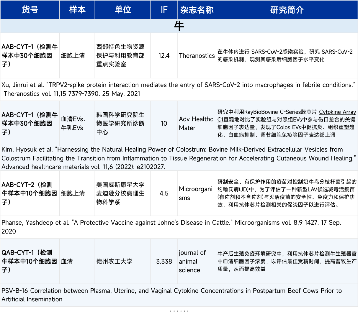RayBio具有多種牛細胞因子檢測的試劑盒,包括多因子檢測(抗體芯片)及ELISA試劑盒、抗原、抗體等,并且已經(jīng)被各種核心期刊文章應(yīng)用。