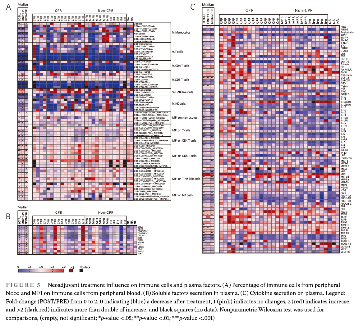研究簡介:Laza-Briviesca等人發(fā)現(xiàn)了基于血液的細胞因子生物標志物,可預(yù)測IIIA期NSCLC患者接受新輔助化療免疫治療的完全病理反應(yīng)(CPR)。基線分析顯示,CPR患者的神經(jīng)營養(yǎng)因子(NT-3, b-NGF)和VEGF-D水平較低,表明免疫環(huán)境的抑郁性較低。治療后,CPR患者表現(xiàn)出免疫激活標志物(4-1BB、MCSF、PARC)增加,免疫抑制因子(Flt-3L、MPIF-1)水平降低,表明通過免疫重編程增強了抗腫瘤反應(yīng)。本研究提出細胞因子譜分析作為一種無創(chuàng)預(yù)測CPR的方法,指導(dǎo)非小細胞肺癌bb0的個性化治療策略